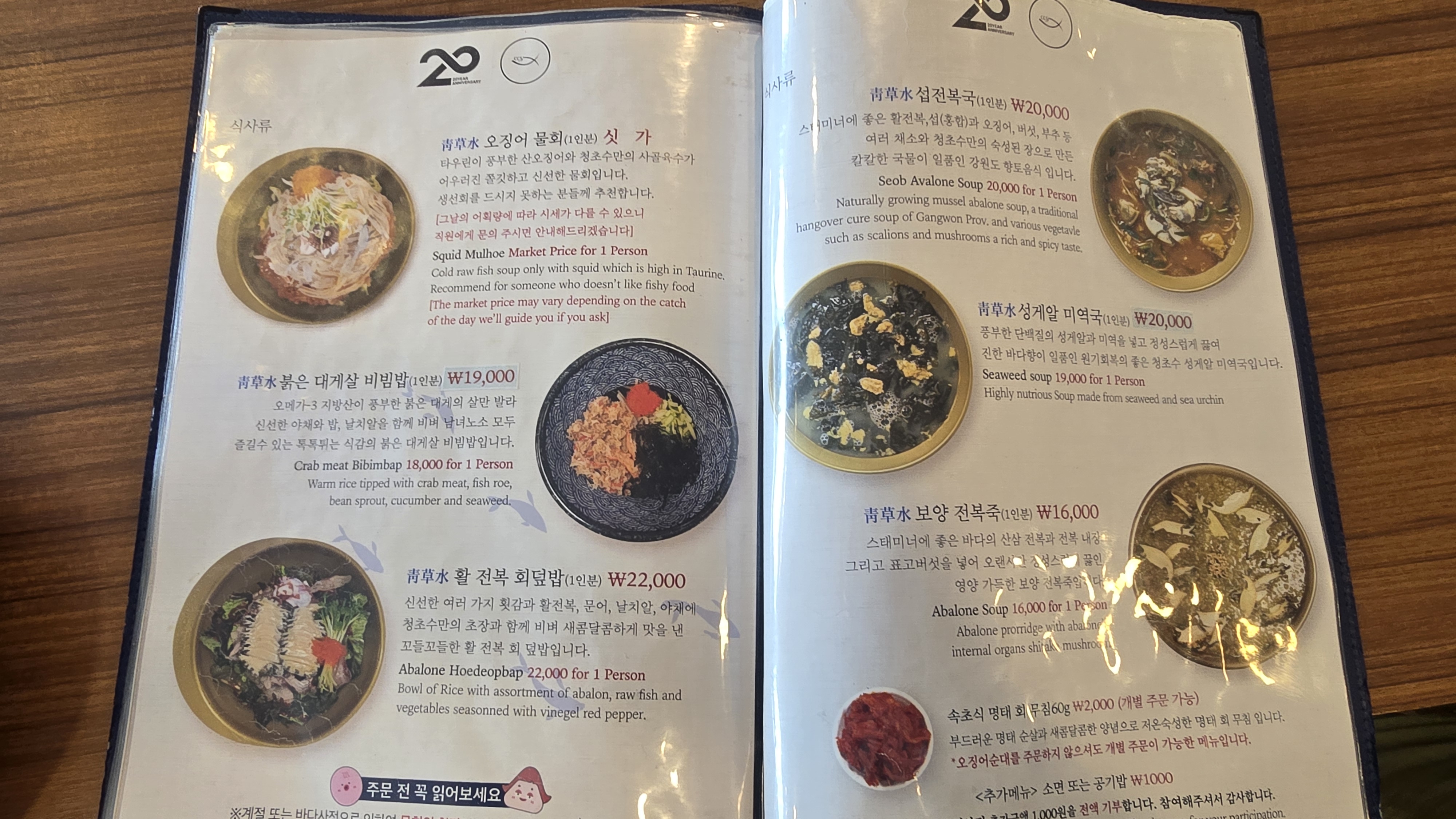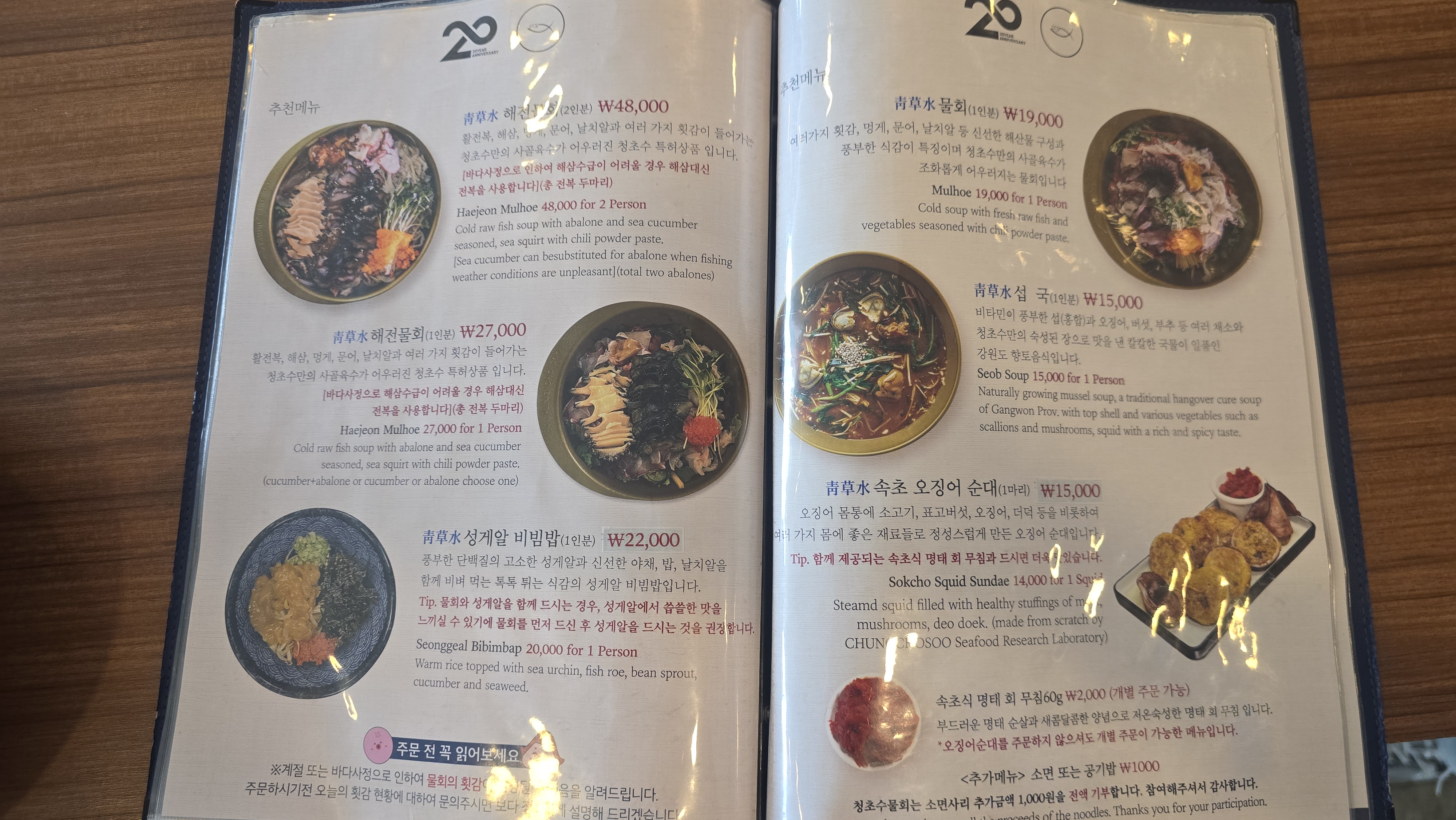 청초수물회 메뉴는 그렇게 많은 편은 아닙니다. 아무래도 물회 전문점이고 찾는 메뉴가 거의 정해져 있다보니 줄이고 줄인 듯한 느낌마저 들었습니다. 가격 또한 맛집답게 조금 쎈 편이었는데 가장 기본이 되는 청초수물회가 19,000원이었습니다. 청초수 회전물회, 청초수 성게알 비빔밥 등이 있었고, 청초수 오징어물회는 싯가에 따라 금액이 책정되기에 미리 메뉴를 생각해 두었다가 예산에 맞게 주문하시면 될 듯 싶습니다.