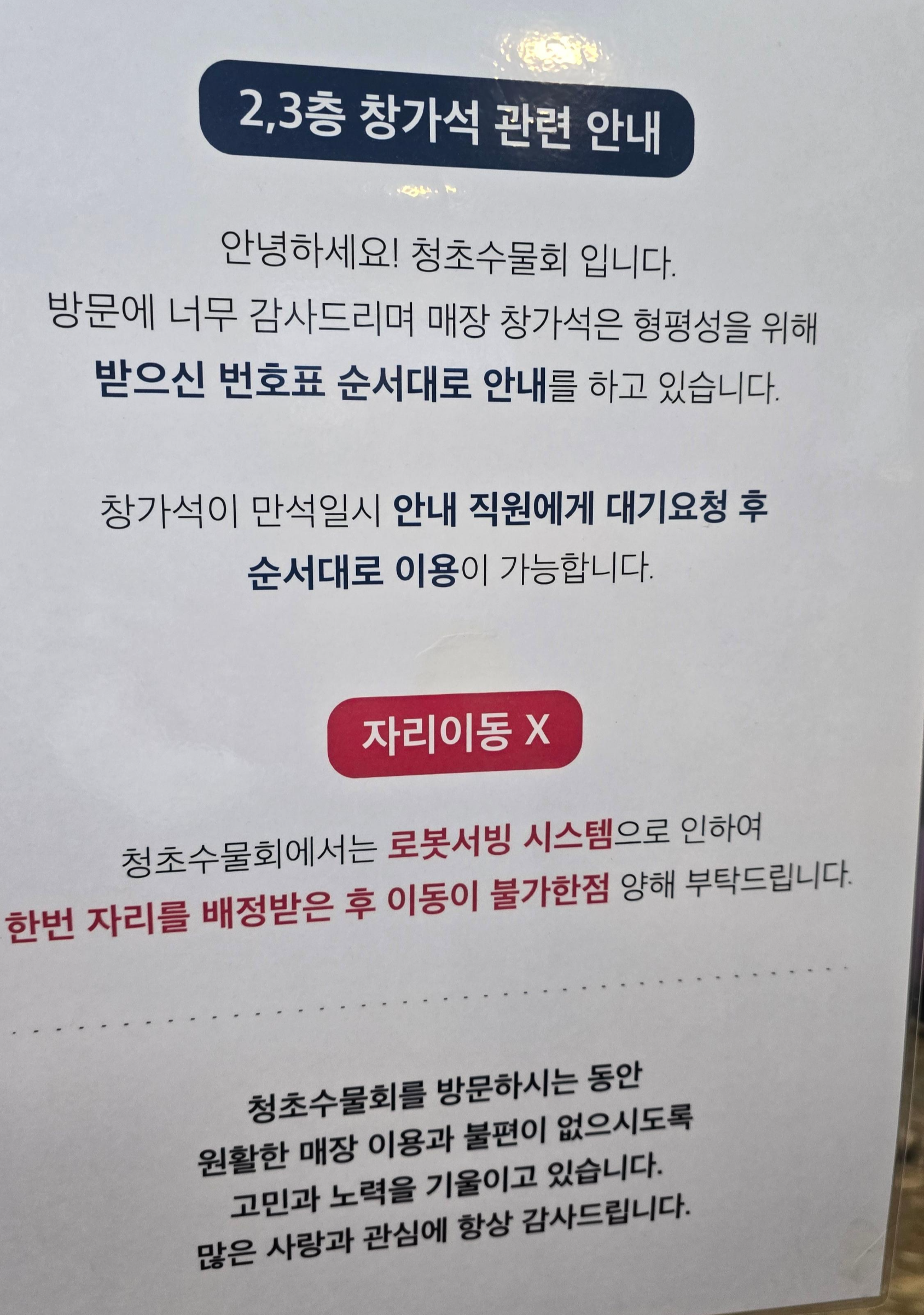 저희 고모부는 이전에 2번 정도 왔다가 대기인원을 보고 포기하셨다고 했는데 저희는 아흔을 넘기신 할머니를 모시고 온 가족 여행이었고, 언제 다시 속초를 오게 될 지 모르는 상황이라 일단 한시간을 예상해 보며 기다려 보기로 했습니다. 다행히 청초수물회 특성상 회전율이 빨라 실제 대기했던 시간은 25분 정도였습니다. 대기 인원만 보고 그냥 지나쳤더라면 후회했을 것 같았습니다.