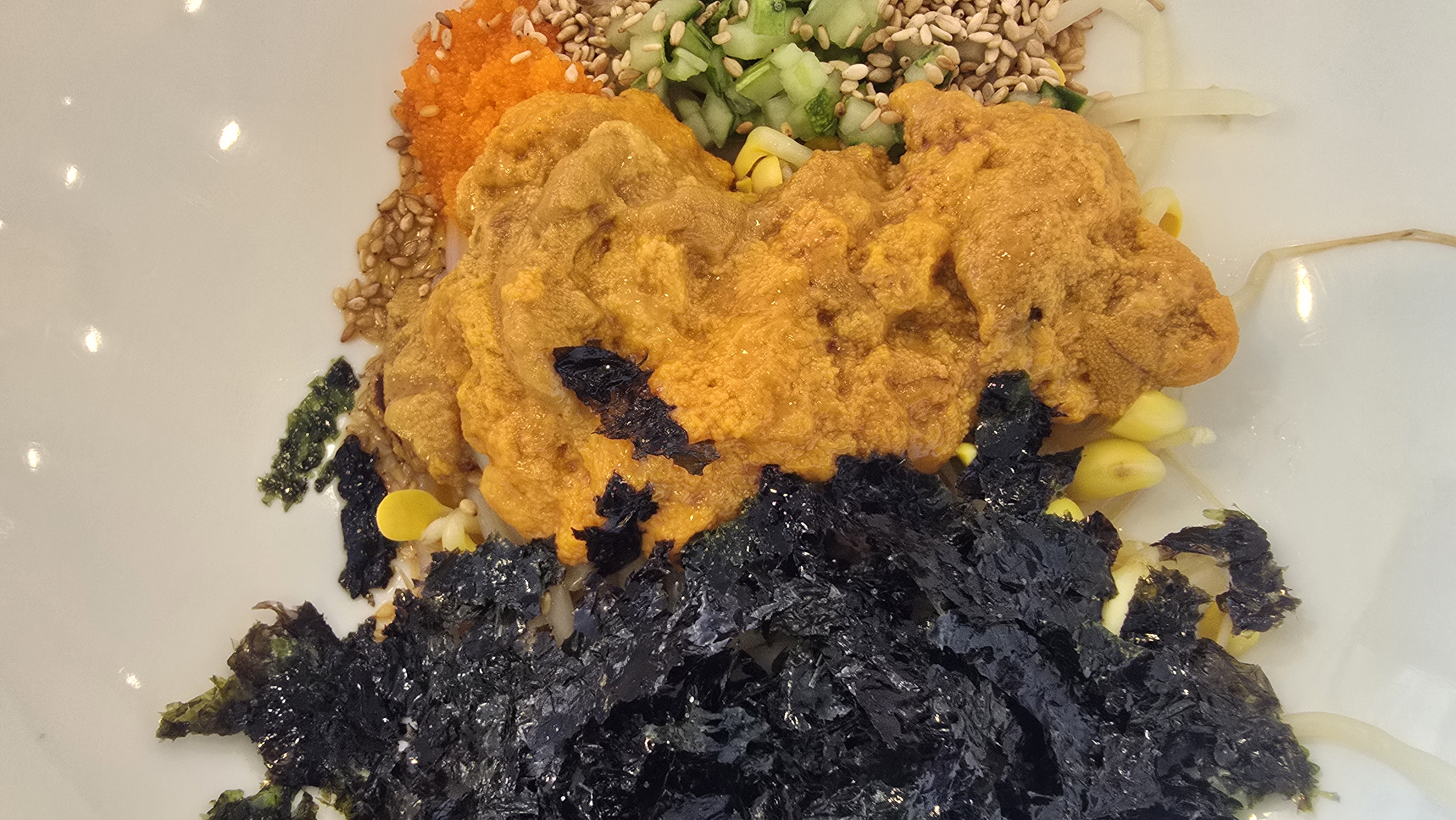요즘 날씨도 더운데 시원한 청초수물회와 성게알 비빔밥을 시켰습니다. 사진처럼 사이드 메뉴가 많이 안 나오는데 드셔보시면 알겠지만 물회 먹다보면 반찬에 손이 잘 안 가게 됩니다. 그만큼 맛있고 스무스하게 목구멍으로 넘어가다보니 정신없이 먹게 됩니다. 대기보다 훨씬 짧은 식사시간을 가지시게 될 것이라 뭔가 아쉽고 허전한 마음이 들기도 했습니다. 맛은 있지만 금방 다 먹어버리는 아쉬움!! 그래서 손님 회전율이 빨랐던 것 같습니다. (오징어순대를 못 먹어본 게 너무 아쉬웠음)