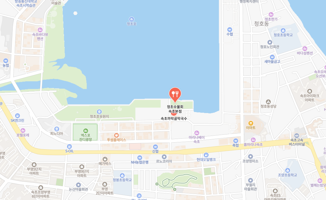 청초수물회 본점의 위치를 지도로 검색하면 아시겠지만 청초호 바닷가에 인접해 있어서 바다를 보며 식사를 하실 수도 있는 속초 맛집입니다. 속초 고속버스터미널에서 도보 15분 거리로 가까워서 속초 여행을 계획 중이시라면 도착 시간에 따라 점심 혹은 저녁 식사로 찾으시기 좋습니다.