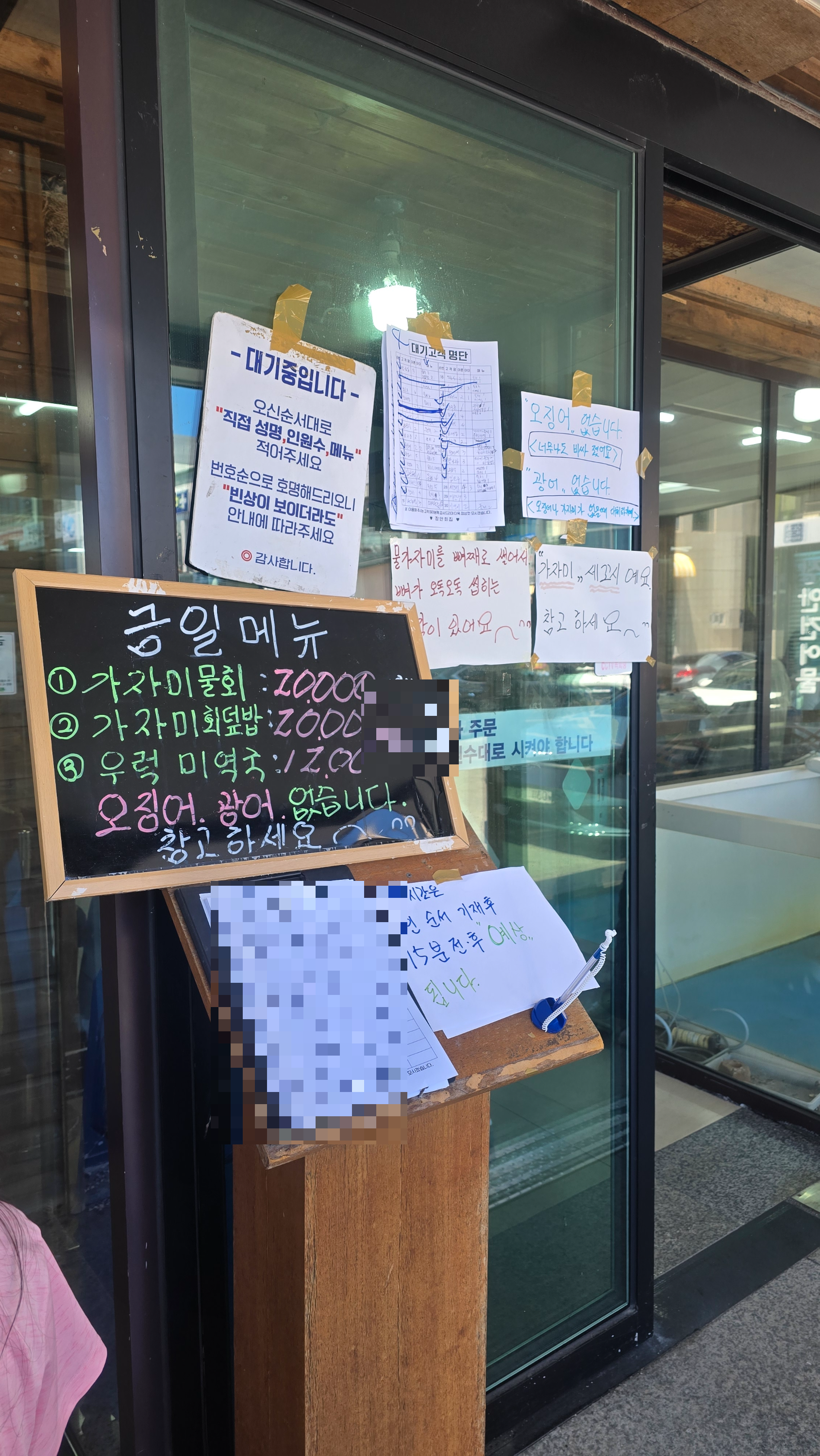 맛집 방문시 일정시간은 대기를 해야 하지만, 물회 특성상 회전율이 빨라 웨이팅 시간이 그리 길지 않았습니다. 앞서 온 대기가 6팀이 있었고 저희가 7번째였는데 대기시간은 대략 15분정도였습니다. 물론 식사하고 계신 손님들의 먹성과 음주 등에 따라 대기시간은 달라질 수 있다는 점은 감안하시길 바랍니다.