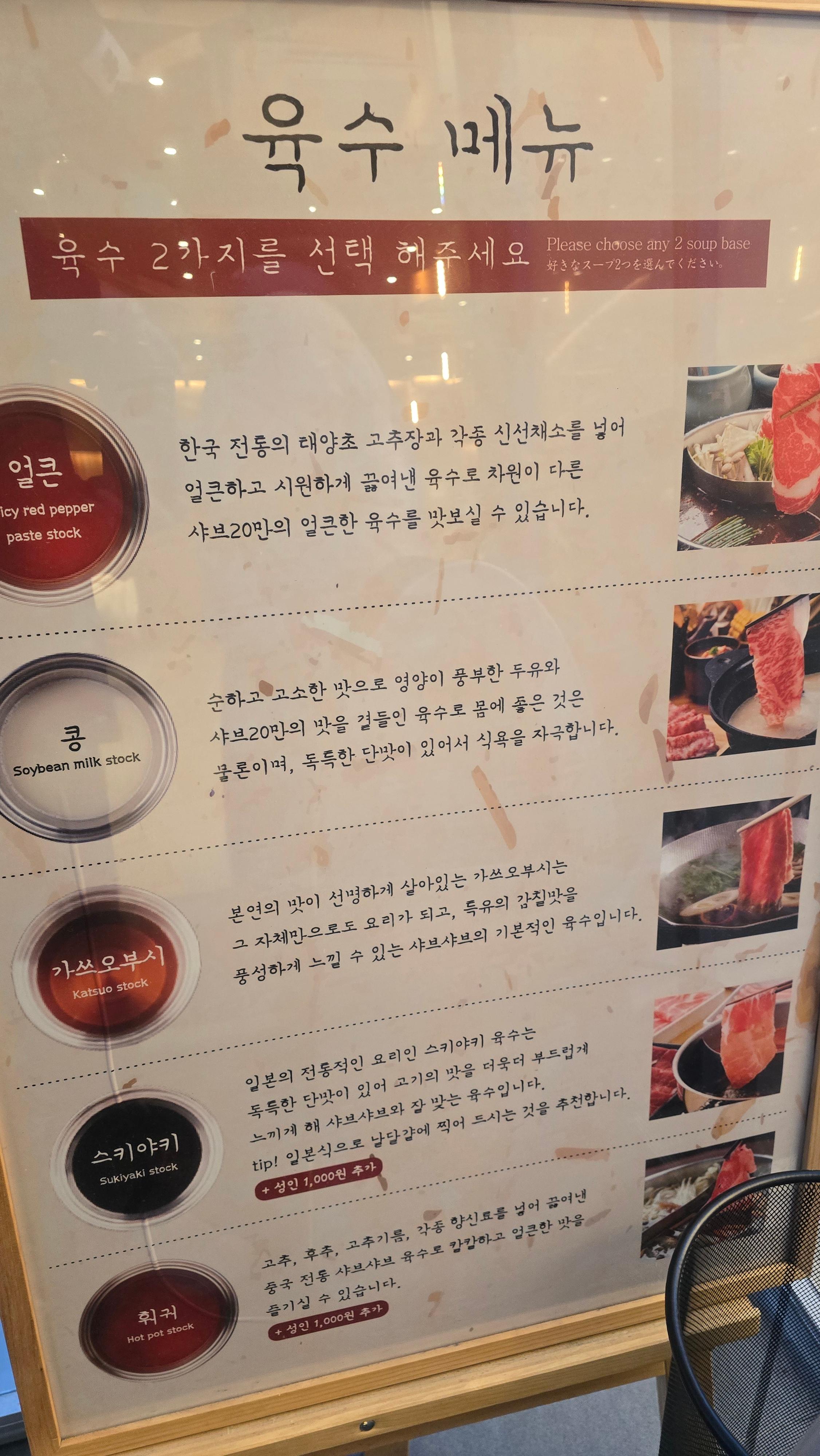 주말에 가다보니 대기시간이 20분 정도 있었습니다. 다른 가족과 같이 가는 거라면 선발대가 미리 가서 자리를 확보하는 것이 좋을 것 같습니다. 일단 대기하면서 육수 메뉴 2가지를 선택할 수 있었는데 저희는 아이들이 있어서 얼큰 육수와 가쓰오부시 기본 육수를 선택했습니다. 나중에 애들이 좀 더 크면 중국식 전통 훠궈를 먹어보고 싶긴 했습니다.